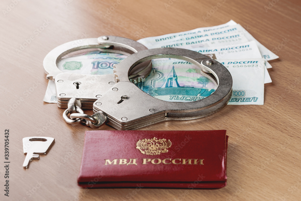 Locked handcuffs, certificate of employee of Ministry of internal Affairs and Russian banknotes. Legal responsibility and monetary fine for violating isolation during coronavirus COVID-19 quarantine.