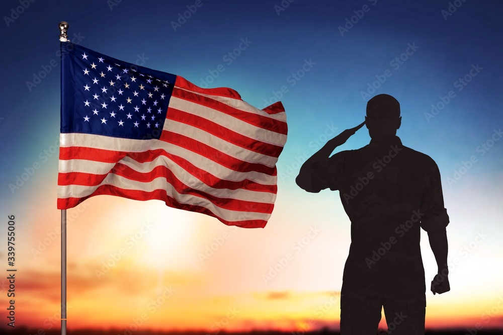 Young military soldier man silhouette on sunset background with USA flag