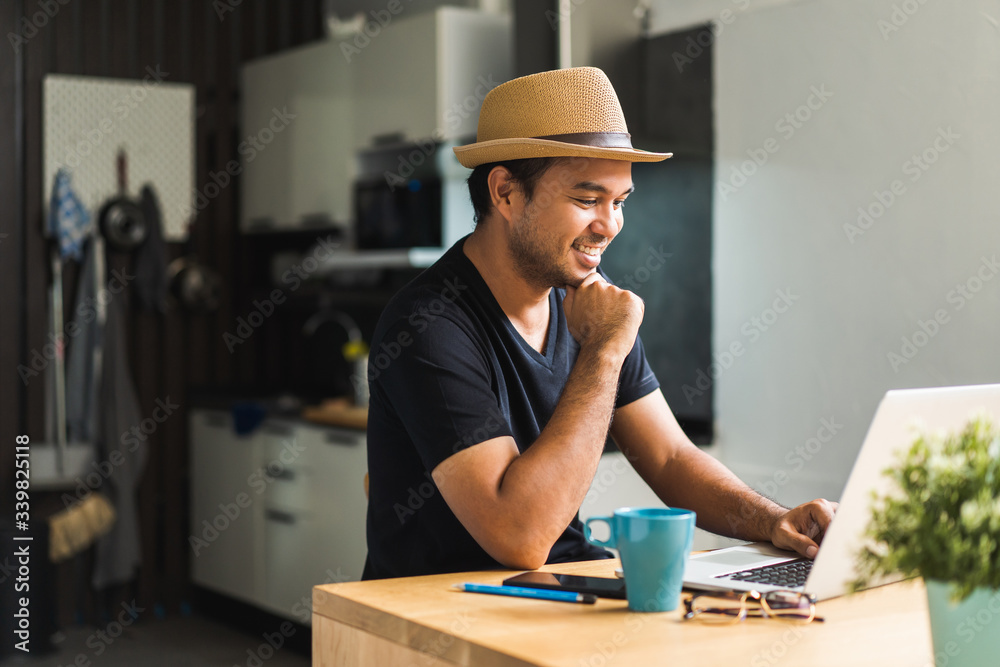 Social distancing concept. Asian handsome man work from home with laptop. Young Casual businessman aged around 30 using laptop for his work.
