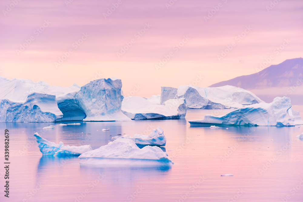 Blue icebergs in Atlantic ocean at sunset. Saqqaq village, west coast of Greenland