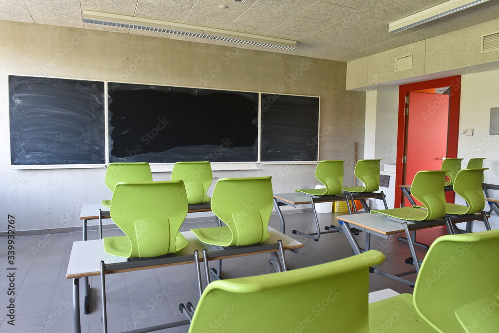 ecole education enseignement confinement rentree reprise vide classe banc chaise tableau covid-19