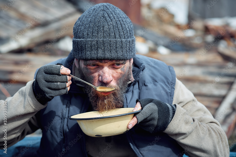 a homeless man eats soup from a plate near the ruins, helping poor and hungry people during the epidemic