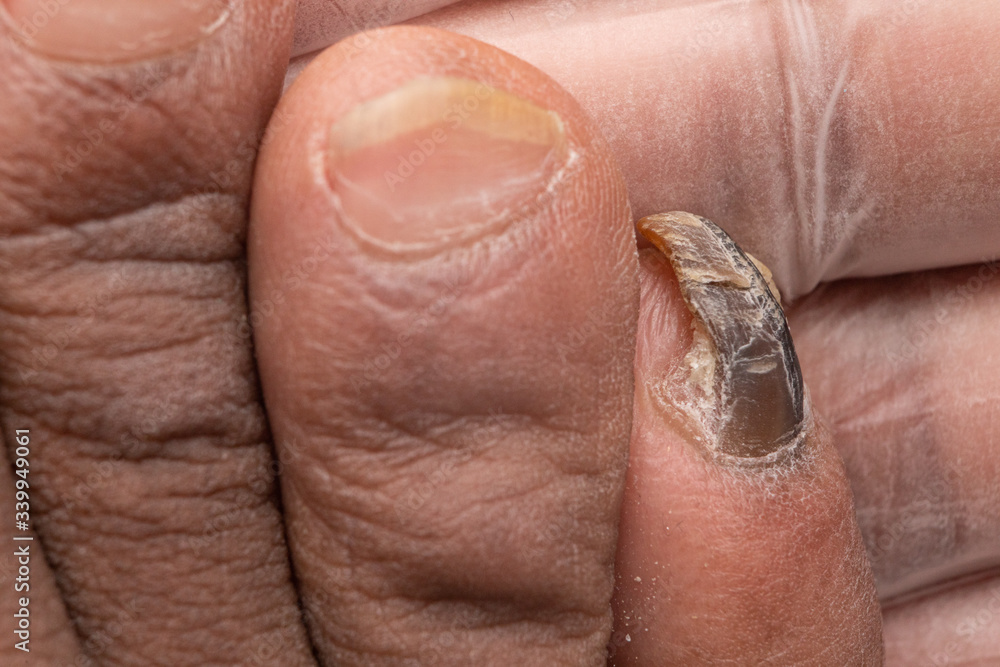 Blackened little toenail destructed by fungal infection. Fungus disease deforming toenail. Medicine and health care concept...