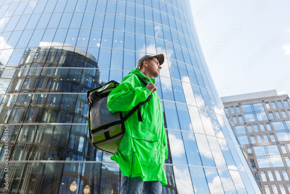 Side view three quarter length shot of male food courier in green uniform walking down city street along modern buildings delivering order in insulated bag