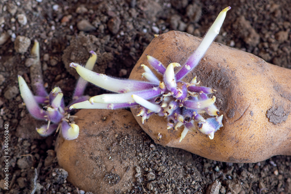 Sprouted potatos on potting soil, close-up