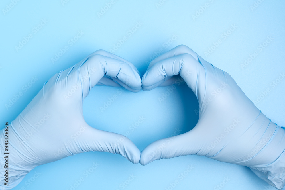 blue hand gloves making heart shape on blue background for care, love or support medical team