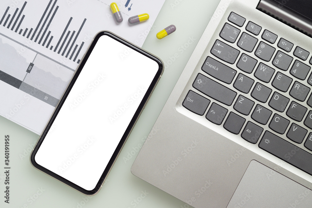 Mockup blank white screen mobile phone with laptop, business charts and medical tablets on working table for covid-19 Coronavirus business crisis background concept.