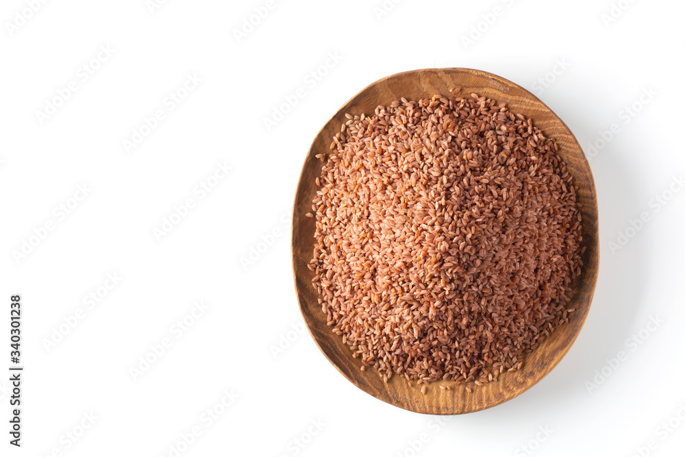 Wooden bowl with red Devzira rice top view isolated on white background.