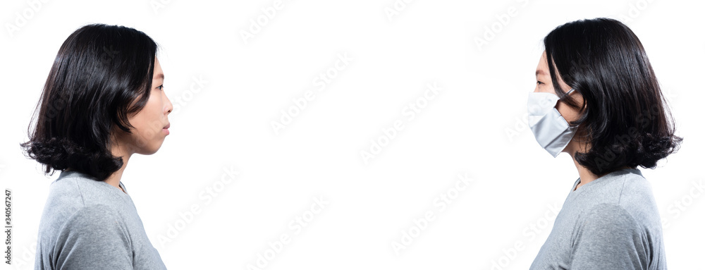 Isolated woman wear face mask protection from Covid-19 with fade of normal life without mask effect change in society of human behavior about wearing mask