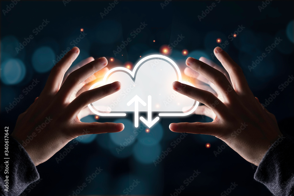 Two hand try to touching illustration of cloud computer for download and upload technology information.