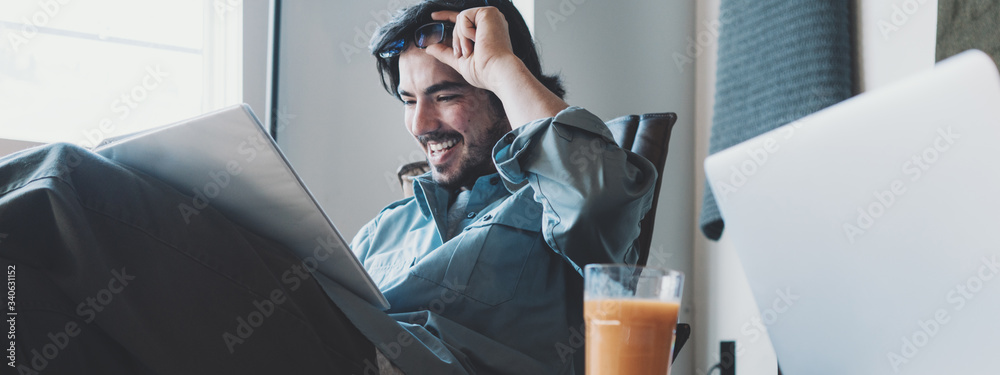 Loft coworking situation. Young man working with documents in studio, developing new project. Paperwork and laptop using. Wide screen panoramic