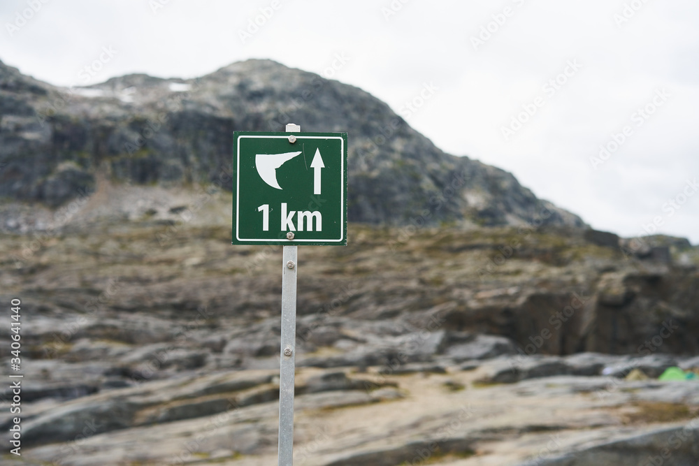 Hiking tourist rout sign to Trolltunga rock with distance, Norway