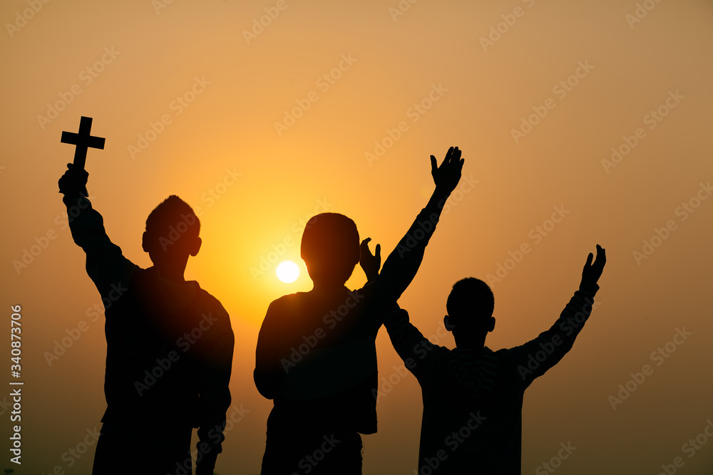 Young christian group holding Cross and lift hands up to sky praying to God with light sunset background, Christians should worship and thank God, christian silhouette concept.