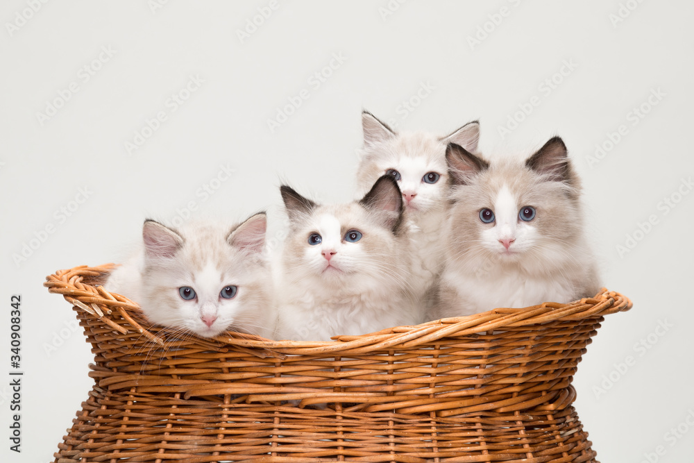Four cute ragdoll kittens in a basket. Studio shot. Solid off white background.