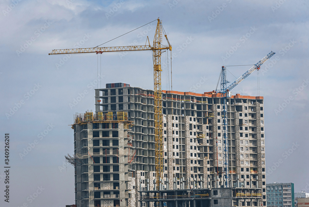 construction of a new high-rise multi-storey building for a large number of apartments. two tower cranes are working at the construction site