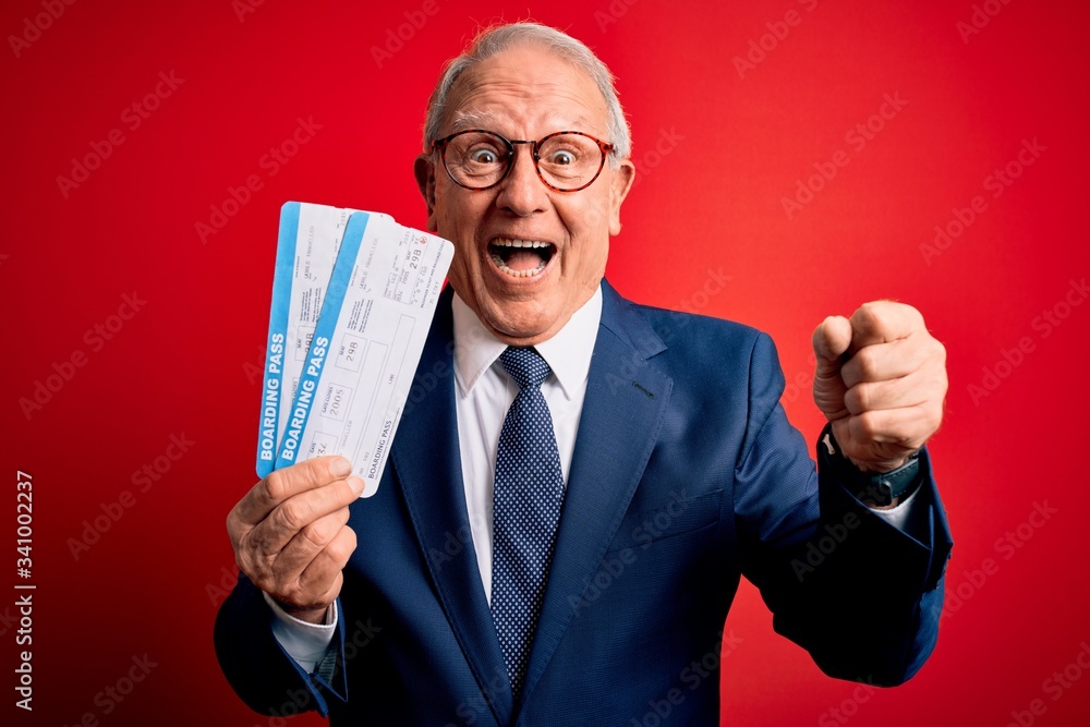 Senior grey haired business man holding airplane boarding pass over red background screaming proud and celebrating victory and success very excited, cheering emotion