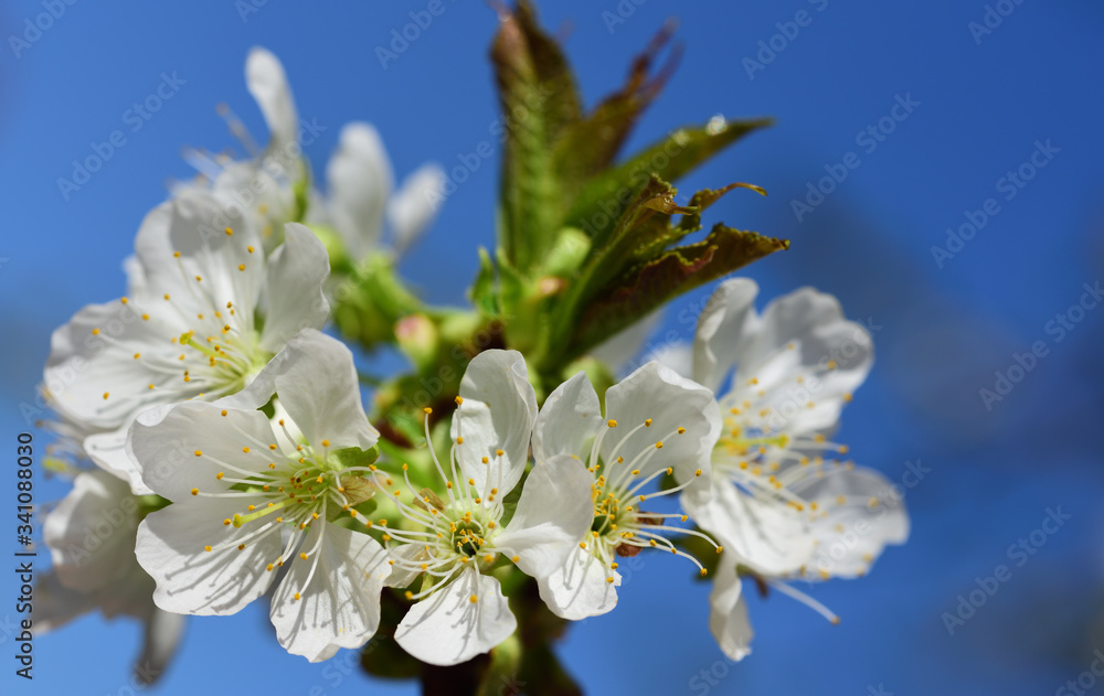 White delicate cherry blossoms bloom in spring on a cherry tree in the sun against a blue sky