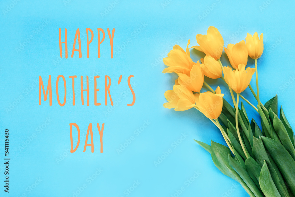 Yellow tulips on a blue background. Mother's Day text. Top view
