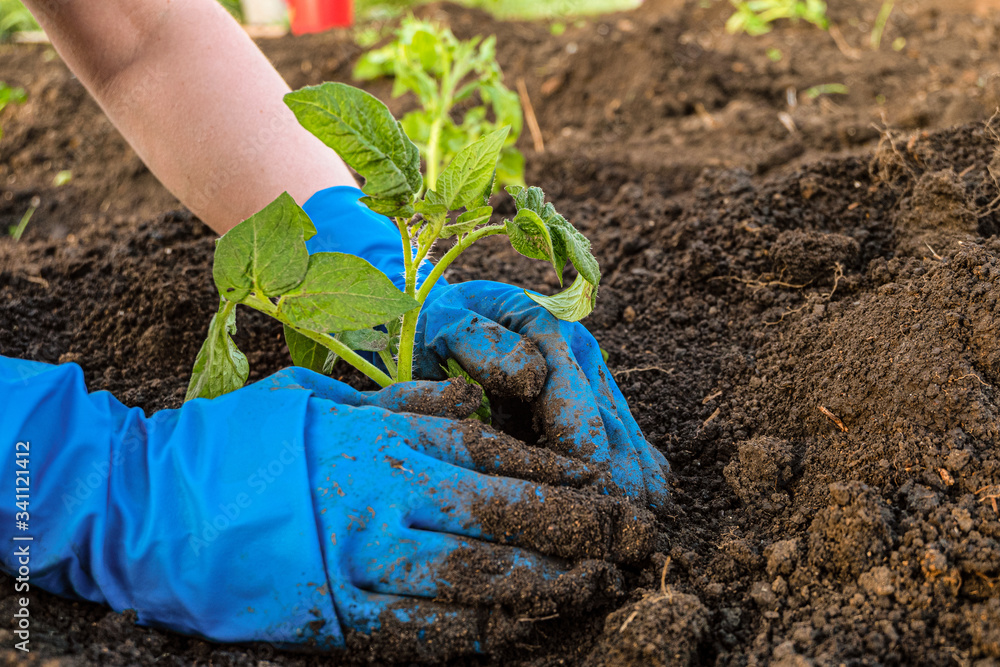 Gardener is planting tomato seedlings in open soil
