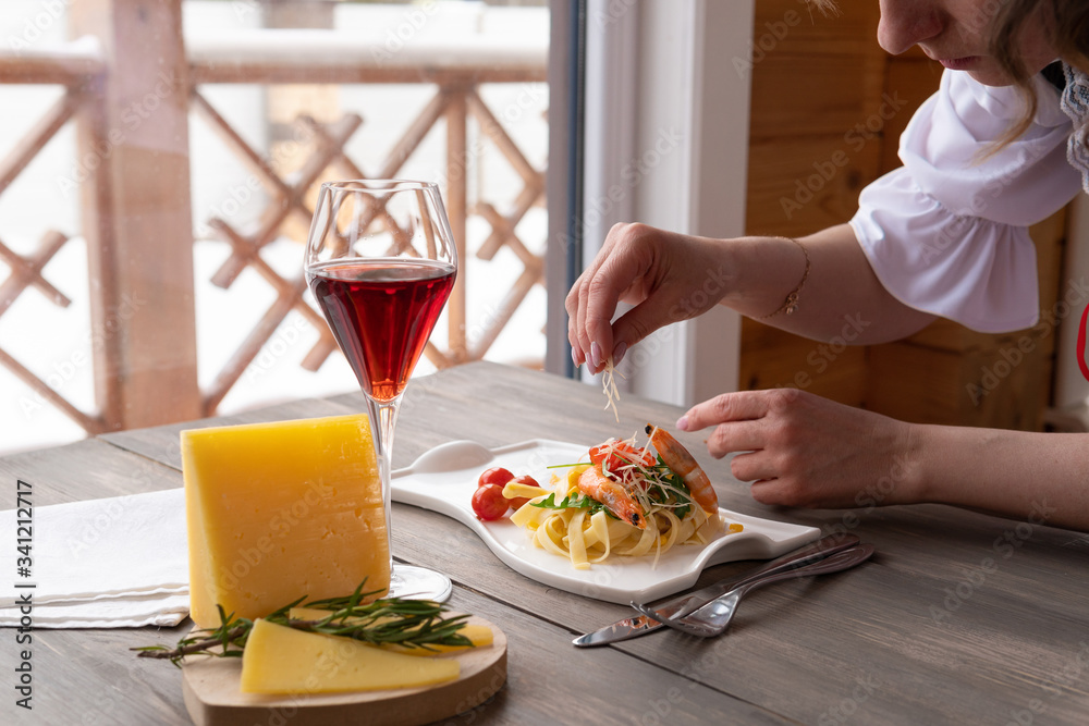 Pasta with cheese and greens on a wooden background by the window