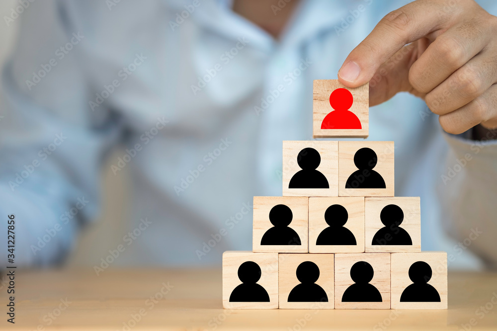 Businessman putting red illustration which printed screen red human icon to top of black human icon. Leader ship and teamwork concept.