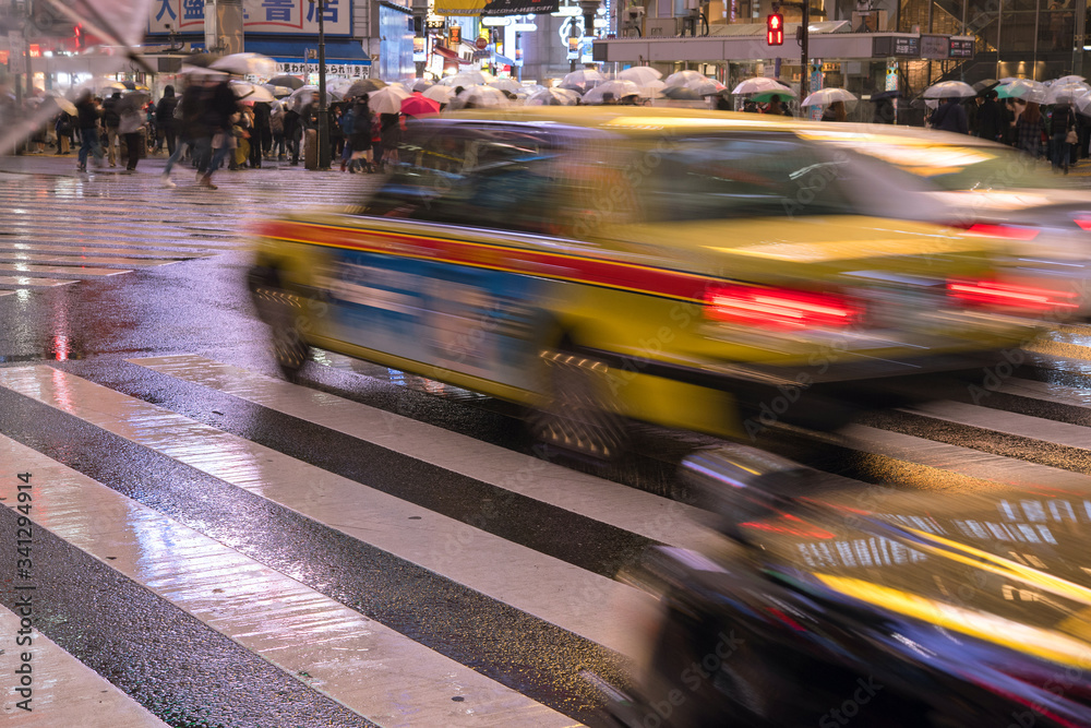 Yellow taxi passing through Shibuya Crossing in Tokyo on rainy night 雨の夜 渋谷スクランブル交差点を走るタクシー