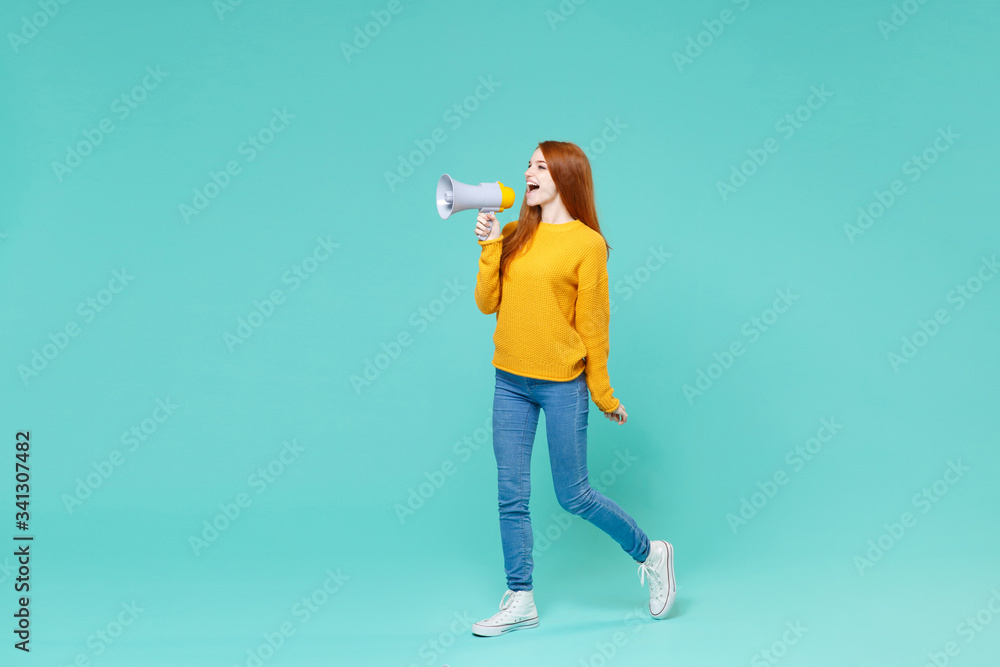 Funny young redhead woman girl in yellow knitted sweater posing isolated on blue turquoise wall background studio portrait. People emotions lifestyle concept. Mock up copy space. Scream in megaphone.