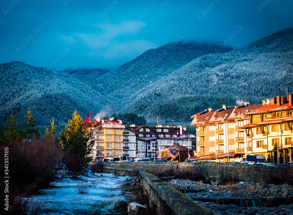Bulgaria Bansko city at dawn street with hotel.