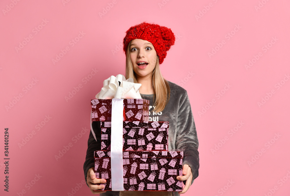 Teen girl in gray reindeer plush pajamas, red hat and socks. She is jumping up against pink studio background. Full length
