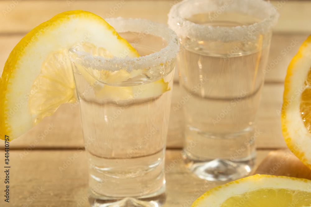 Two glasses of tequila and lemon and salt