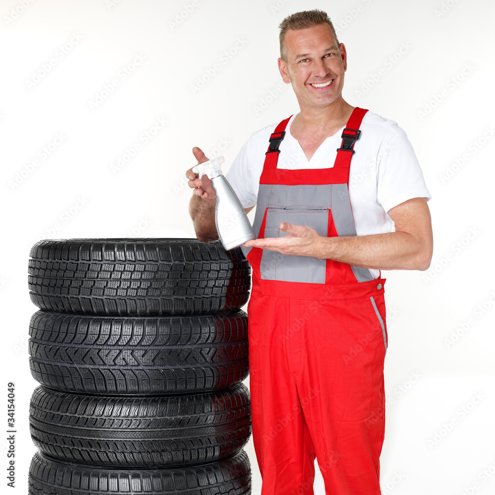 Motor mechanic next to a set of winter tyres holding a bottle