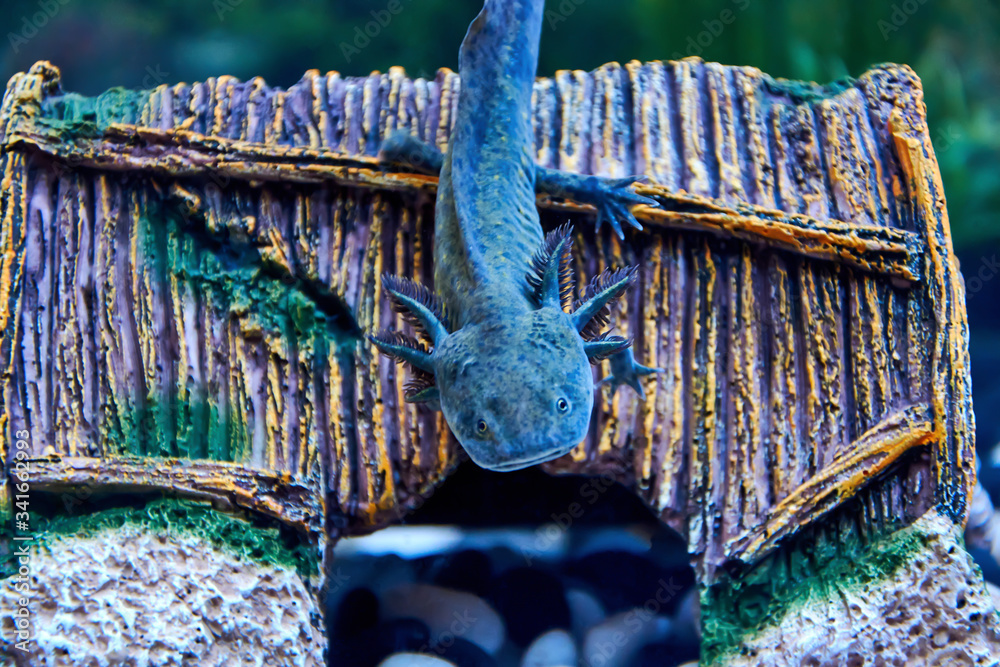 The dark green black young Axolotl (Ambystoma mexicanum) descends head down on the roof of a brown ceramic house in the aquarium.