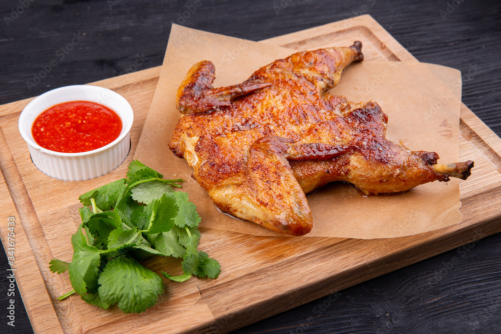Chicken tobacco fried on coal with garlic, served with greens and ketchup