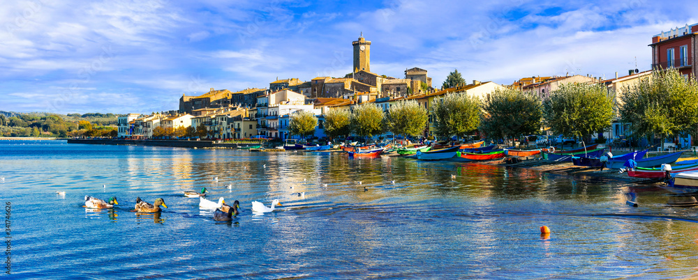 Italian lakes . beautiful lake Lago di Bolsena and scenic medieval village Marta. Italy