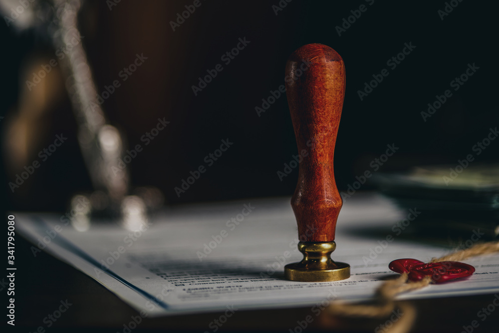 Notary's public pen and stamp on testament and last will. Notary public tools.
