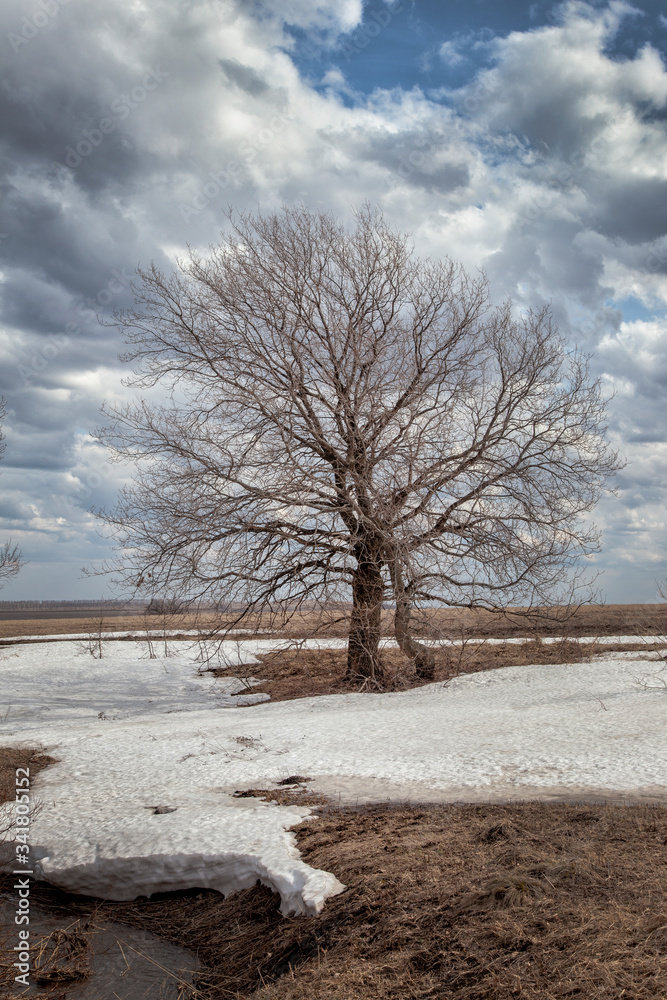 Spring, April landscape in central Russia, spring streams and the remnants of un-melted snow.