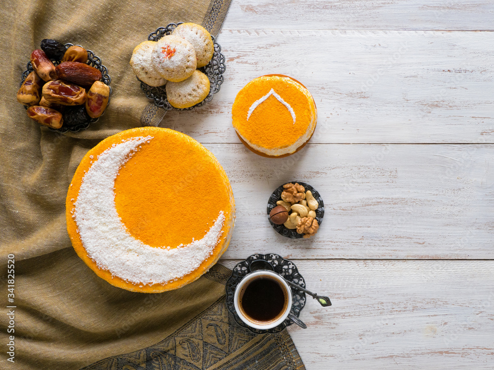 Festive food Ramadan background. Delicious homemade golden cake with a Crescent moon, served with black coffee and dates. Top view.