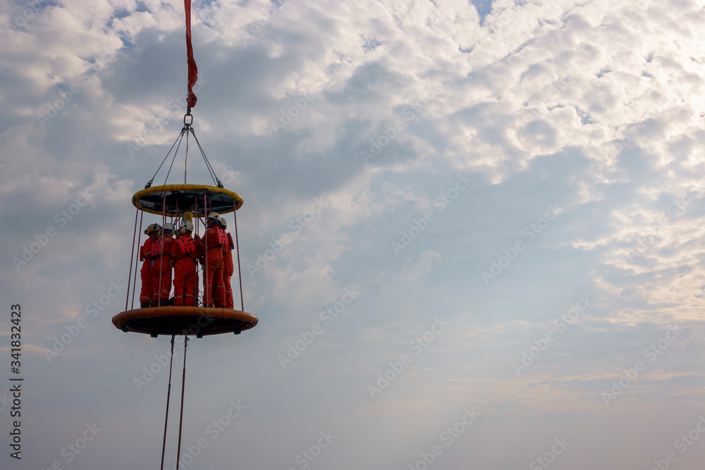 Offshore transportation. Offshore workers.A group of offshore crew hanging in the middle of the sea during crossing from a barge to oil and gas platform using personal transfer basket.