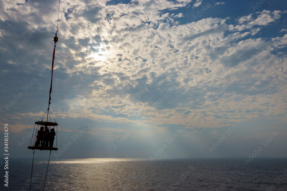 Offshore transportation. Offshore workers.A Silhouette of offshore crew hanging in the middle of the sea during crossing from a barge to oil and gas platform using personal transfer basket (PTB).