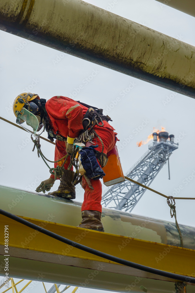 Working at height. An abseiler wearing Personal Protective Equipment (PPE) step on the pipeline to check surfaces prior to start painting activities with background flare tip burning in the sky.