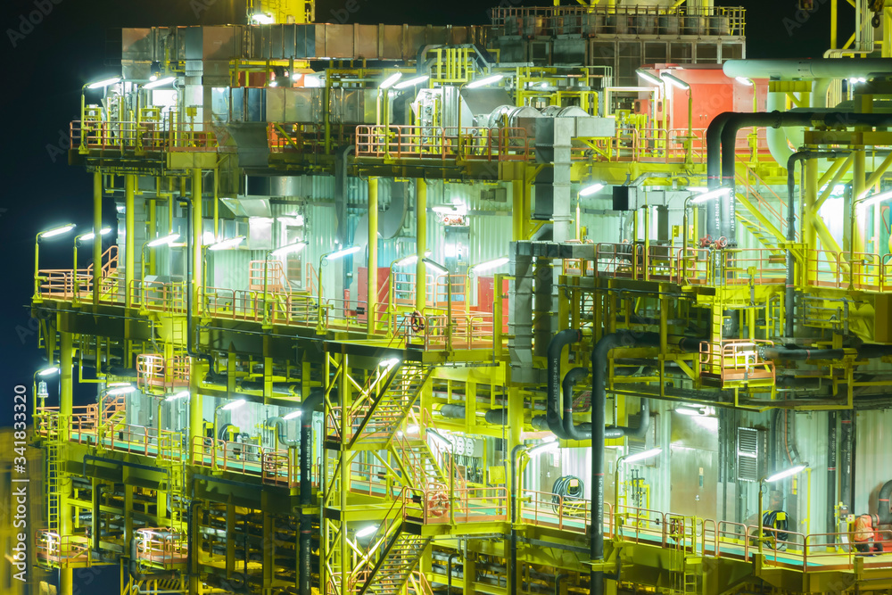 Oil and gas industry. Close up of night scene at oil and gas platform complex at process area with pipelines and valves.