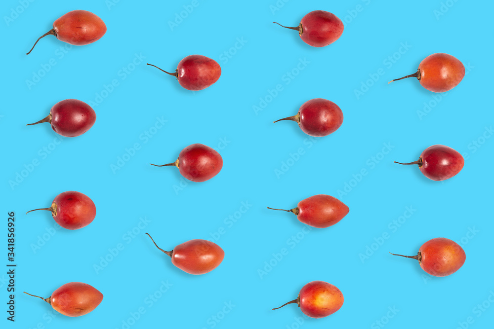 Fruit pattern of raw tomarillo or tomate de árbol on blue background from top view
