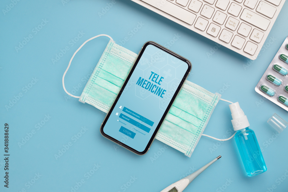 Telemedicine online application background concept. Mockup mobile phone with facial masks, clinical thermometer, medicine tablet and Alcohol Mini Hand Sanitizer Spray.