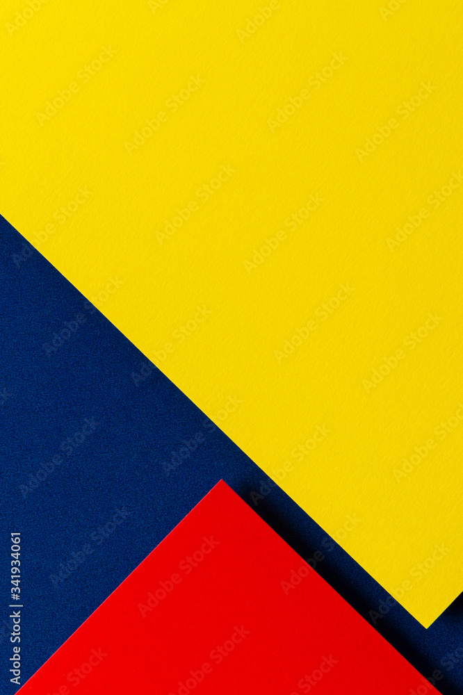 Abstract colored paper texture background. Minimal geometric shapes and lines in blue navy, red and yellow colours