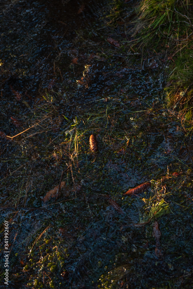 Fir cones on soft thawed moss