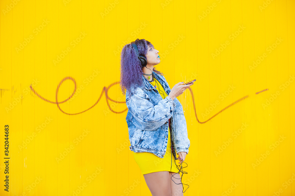 Side view of millennial woman isolated on yellow background. Fun teen colors. African american woman listening to pop music on the street with mobile phone. Technology and urban youth concept.