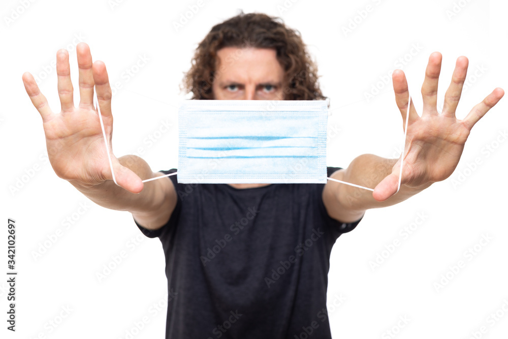 Emotional guy in medical mask. Pandemic coronavirus epidemic covid-19 quarantine isolated white