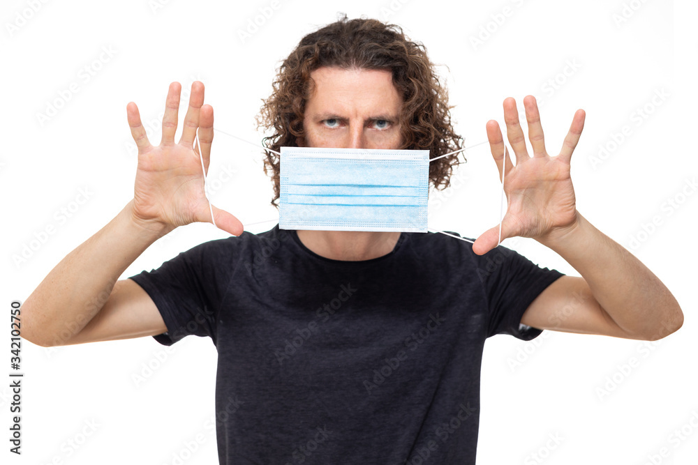 Emotional guy in medical mask. Pandemic coronavirus epidemic covid-19 quarantine isolated white