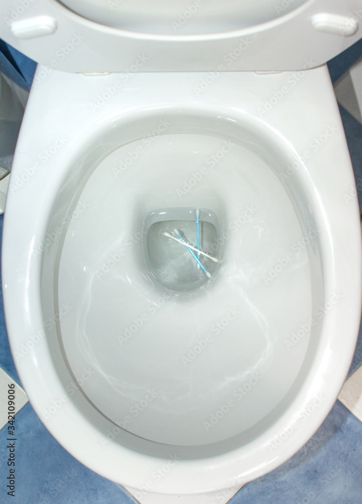 Cotton swabs thrown in a toilet of a home. Concept of bad habits for the environment, pollution, plastic contamination...