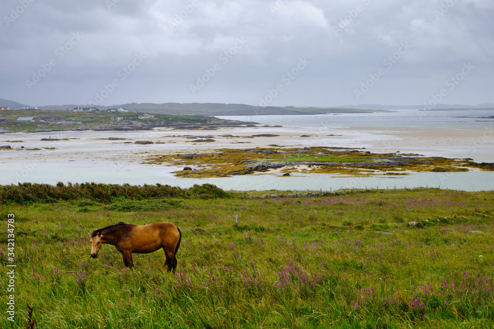 A Connemara pony horse grazing freely in the wilderness of Connemara.